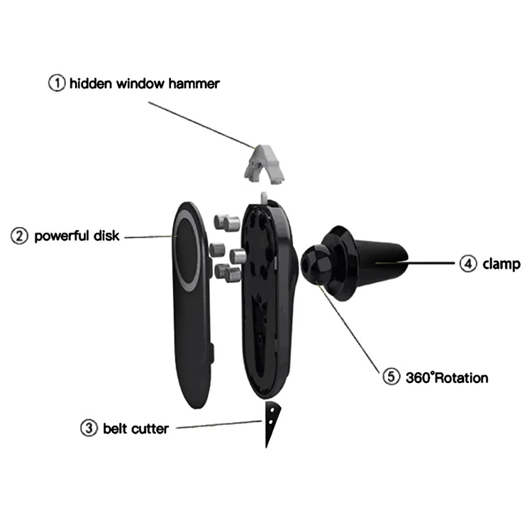 Zasnova 3 v 1 ta pripomoček v nekaj sekundah spremeni iz preprostega držala v orodje za nujne primere. Kladivo za skrito okno je diskretno, a učinkovito, oster rezalnik jermena proti rjavenju pa uporablja natančno zlitino, da v nujnih primerih takoj prereže varnostne pasove.